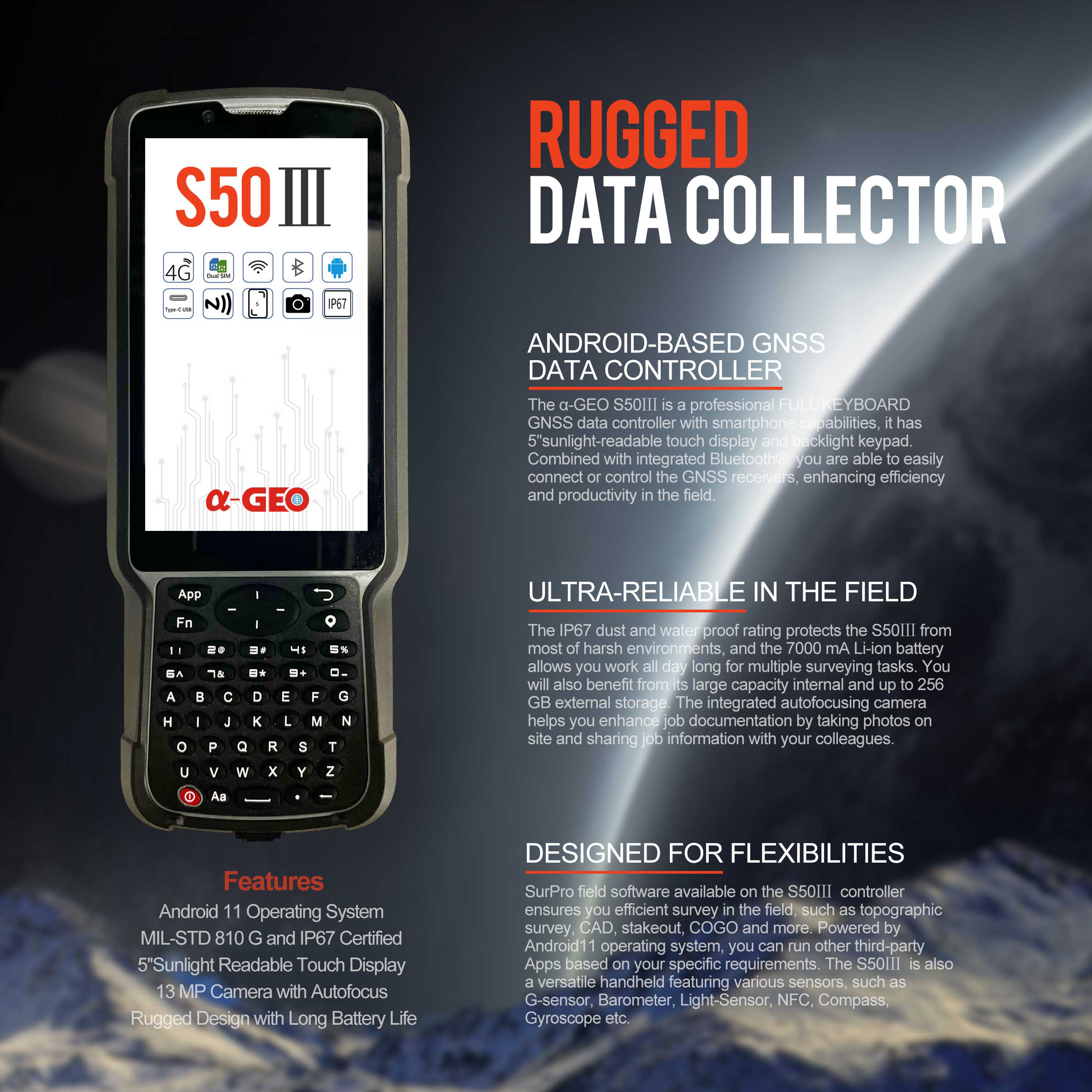 α-GEO S50Ⅲ este un controler de date GNSS FULL KEYBOARD, cu capabilități pentru smartphone, are un afișaj tactil de 5 inch, care poate fi citit la lumina soarelui și o tastatură cu iluminare de fundal.